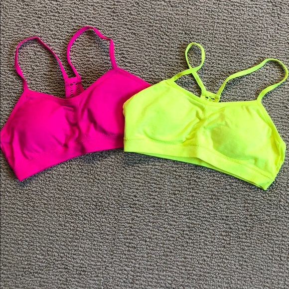 They are very bright colored and pretty. I have never worn them! Both of them have a design on the back and the back is like a sports bra.