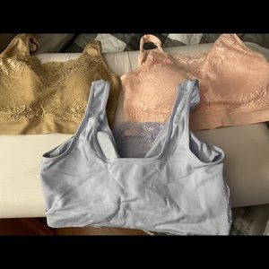 Pull on. Has removable cups. Stretchy back and lacy front. Taupe, light lilac, light peach. Great shape. Very pretty. All 3 for one price.