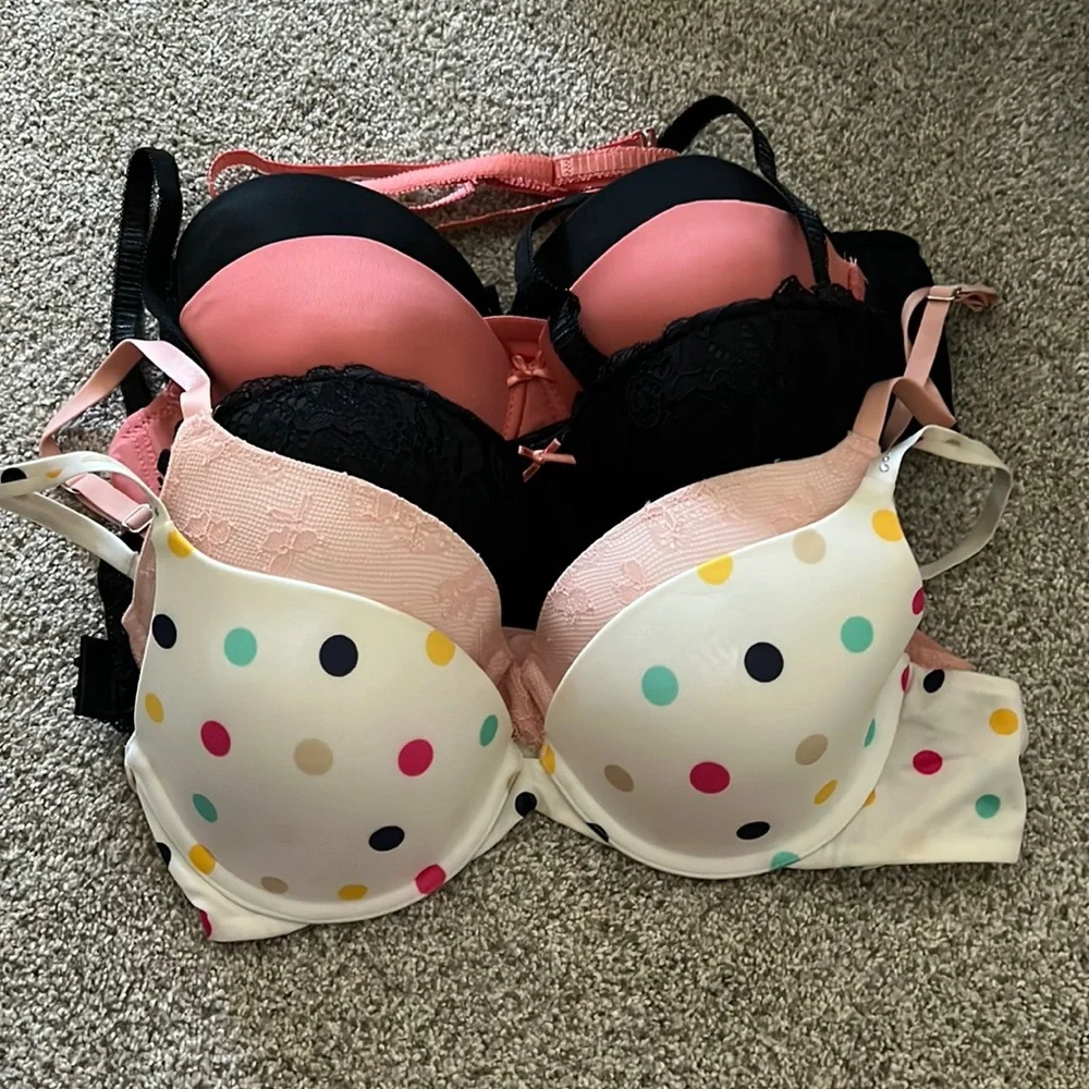 36B and one 34 C but all similar sized. Back 2 are strapless (pink and black), middle black lace, front 2 are VS. All push up bras. Smoke free home.
