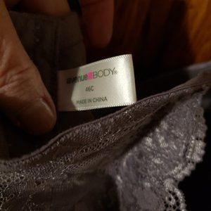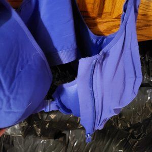 1st is a NEW never worn blue underwire sports bra with a front closure and a front zipper closure from Avenue size 48D. 2nd is a purple unlined lace bra, size 48C. 3rd is a NEW never worn purple bra from Avenue size 46C.