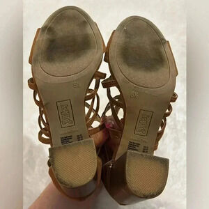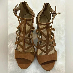 Brash Carmel Tan Suede Strappy Block Heel Sandals 8.5 Y2K 2000’s going out shoes