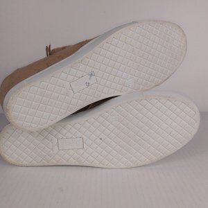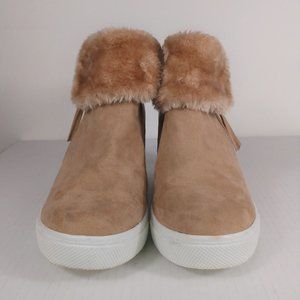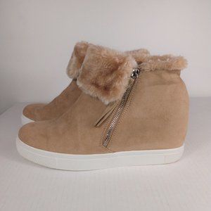 Used good condition. Fun super cute tan Brash Wedge boots with faux fur cuffs and side zippers. Zippers are on track and soles show minimal wear. 3 1/2 inches platform heels.