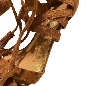 Brash Sexy Lace Up Cut Out Sandy Brown Suede Block Heel Sandal Back Zip Bootie size US 7