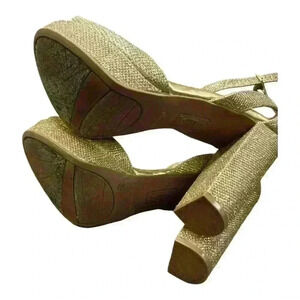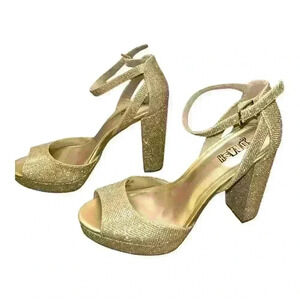 Brash Shoes Womens Sz 8.5 Gold Sparkle 4.5”High Heel Open Toe Strappy Platform
