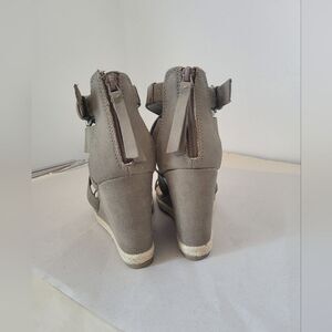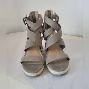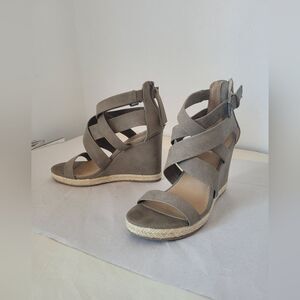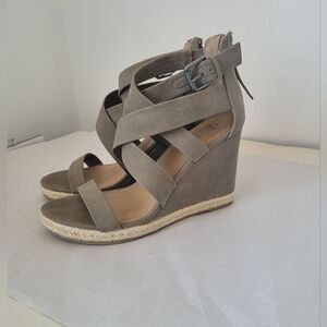 Very cute wedge sandals in a Neutral taupe color. Back zip closure with front criss cross straps and open toe. Faux Suede material. Good condition, very minor wear, see all photos. 4 inch heel. US size 9.