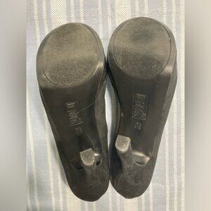 Brash black platform heels. Fabric uppers, manmade balance. 1” platform, 5 1/2” heel. Size 8.5. Worn once; like new!