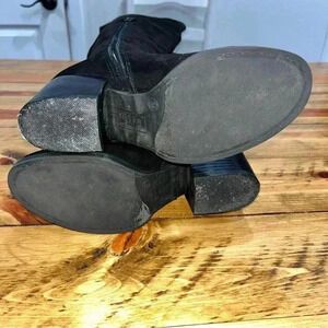 These suede look over the knee boots are adorned with a 3”heel, 1/2 side zip.  Black in color means they match virtually anything.  Great with skirts, short or long, pants or jeans.