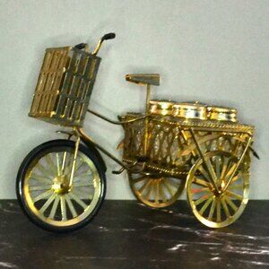Brass 3 wheeler bike that holds 4 small salt and pepper shakes in back. There is a compartment on handlebars that could hold toothpicks. All wheels turn, the front will move from side to side a little. The handle bars are rigid. There are no brand or origin markings.