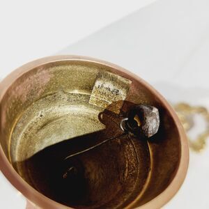 One bell looks chipped on the top loop where string goes through. String has 4 small bells approximately 1" big or smaller. Plate may be plated in brass, as there are some spots in the center. Hand bell has been polished on the outside. Please thoroughly review photos for quality and condition of item.
