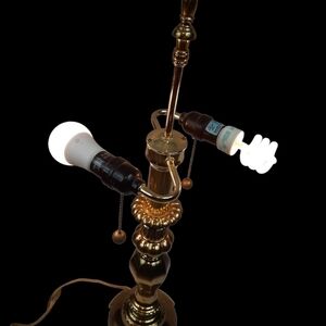 Mid-century Modern, Hollywood Regency brass candlestick table lamp in Vintage bronze finish, with dual bulbs, and brass bell pull strings.