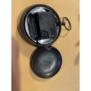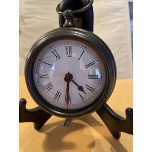 This decorative clock features a brass cased design with Roman numerals, giving it a classic and vintage look. It operates with a quartz movement, powered by batteries for convenience. The round shape and brown color add a touch of elegance to any room. Made with brass, glass, and metal, this novelty clock features an art nouveau style with a bronze finish, making it a unique and charming addition to any collection or decor. Scratching on back. Preowned