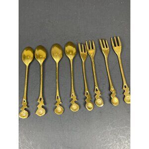 This vintage set features four mini spoons and four forks, crafted from brass. Ideal for collectors or as a decorative addition to any dining setting.