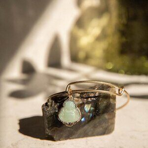 Features: This beautiful, versatile bangle is designed with a sliding mechanism to easily adjust from 2 to 3.5 inches wide. The etched Buddha charm with a dyed Jade-like stone adds a touch of serenity and spiritual energy. Crafted with nickel-free brass and copper, it's lightweight yet symbolic—perfect for daily wear or to add a mindful element to your look.