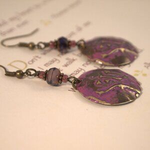 Brass Hand Embossed Earrings Purple Czech Glass Earrings Patina Brass Earrings