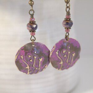 Brass Hand Embossed Earrings Purple Czech Glass Earrings Patina Brass Earrings Dangle Pierced or Clip-on Earrings Brass Embossed Earrings