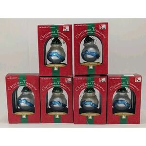 The Brass Key Christmas Traditions Classic Miniatures Hand Crafted Snowman Ornaments are a set of 6 small, multicolor glass ornaments in the shape of snowmen. Each ornament is hand-crafted and features a classic style with vintage accents. These hanging decorations are perfect for Christmas and can be used for multiple purposes. Made in China in 2001, these ornaments are part of a collection that celebrates holiday traditions with a touch of nostalgia.