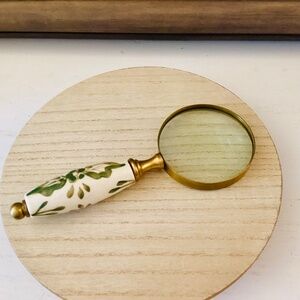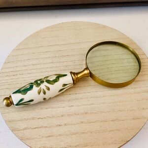 Brass Lupe Magnifying Glass Ceramic White Green Floral Handle 7.5” Elegant Gift