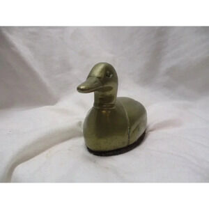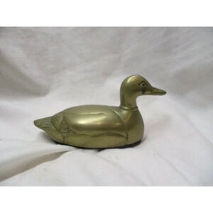 Brass Duck with an aged, vintage patina. Leaving it up to buyers to polish if they so desire. Measuring roughly 6 inches long, 2.5 inches wide, and 3 inches high. A fun medium-sized piece. It's in decent vintage condition. The felt pad underneath is slightly peeled. Please see the photos.