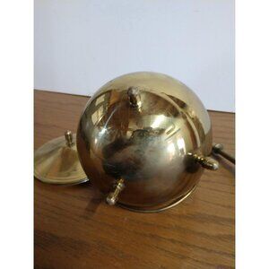 Brass fire starter pot/smudge pot. It comes with a pumice stone wand with a brass handle. The pot stands on 3 brass feet. It has a round lid with a round finial on top. There is an opening in the lid for the wand to sit nicely.