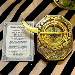 franklin mint sundial, equinoctial sundial compass, vintage scientific instrument, gold desk decor, antique style navigation, explorer gift, collectible timepiece, celestial navigation replica, compass gift for men, luxury brass compass, rare franklin mint item, study decor vintage, steampunk aesthetic piece, instrument of time and travel, bachelor pad, man cave