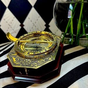 • Equinoctial sundial and compass combination with gold finish - comes with original wooden base