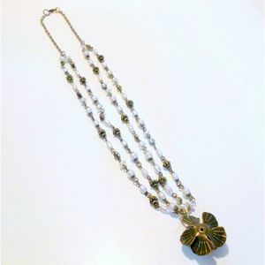 Brass Tone Faux Pearl Multi Strand Rose Pendant Necklace *