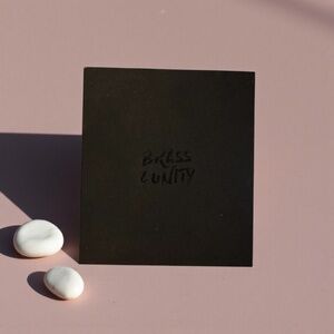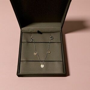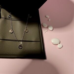NWT Brass & Unity silver-tone necklace featuring a delicate chain with small round disc charms engraved with the brand’s signature logo.