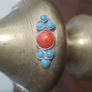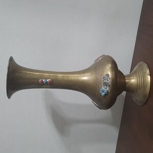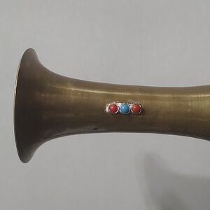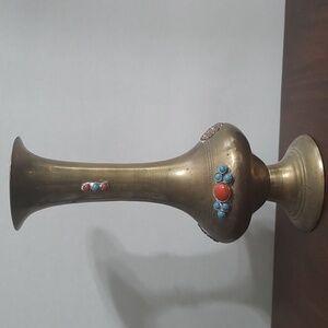 This is a vintage Indian brass bud vase with inlaid stones, typically made of turquoise and coral or glass simulating them.