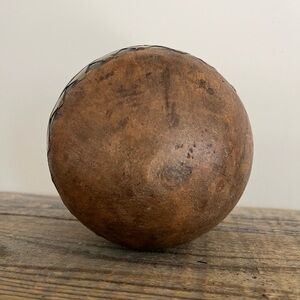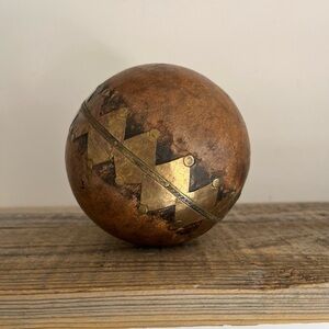 Very unique piece! About 5” diameter. Brass details around what looks like wood but I believe is too heavy for wood. Really unsure of the purpose of this or what the other material is. Reminds me of the balls thrown in the Quidditch game! Very mid century