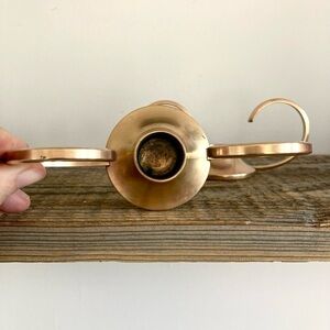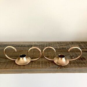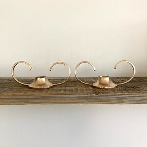 Solid brass candlesticks set of 2 vintage. Unique style I’ve never seen before. Curled matching handles. Very pretty. In good used condition. Some light areas of patina.