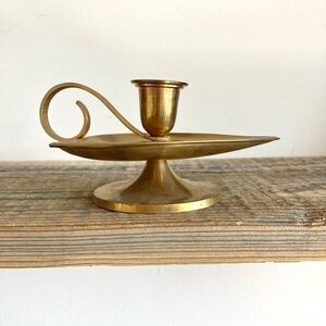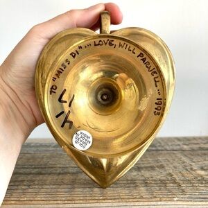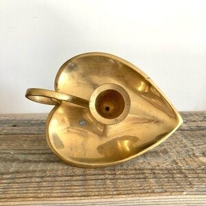 Solid brass heart chamber candlestick with finger hold and drip tray. Drop tray is heart shaped. Very cute piece! Has spots of patina as shown in photos.