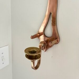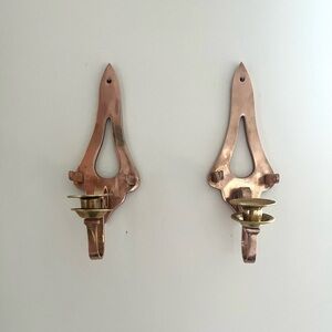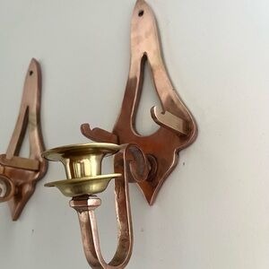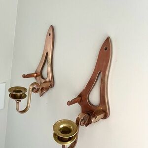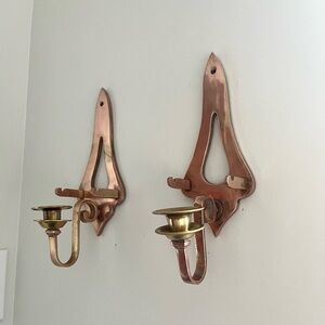 Solid brass wall sconces set of two for tapered candles. Very nice vintage piece! Has a spot to hold a candle snuffer. I believe the cup and drip tray have been replaced on this set. They’re a slightly yellower brass than the body. Please view photos.