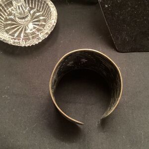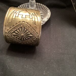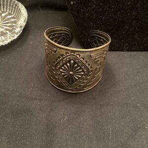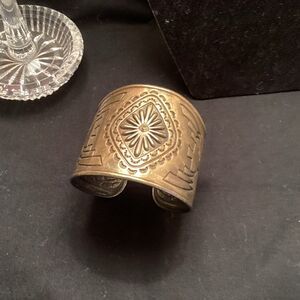 This brass tone cuff features Native American symbols engraved throughout. It slides over the wrist sideways and has an inside diameter of 2 1/4”. It is 2” at its widest point and 1” wide at its narrowest point. Would fit up to and including an 8” wrist.