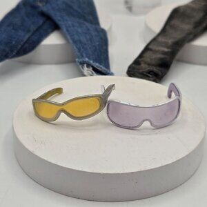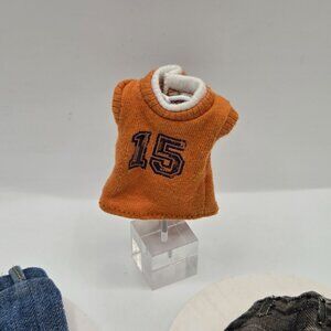 This Bratz Boyz "The Funk Out" collection includes a stylish orange T-shirt with a "15" logo, two pairs of jeans, and two pairs of sunglasses. Designed for Bratz dolls, this set offers versatile clothing options to mix and match, enhancing any Bratz doll's wardrobe with a trendy and sporty look.
