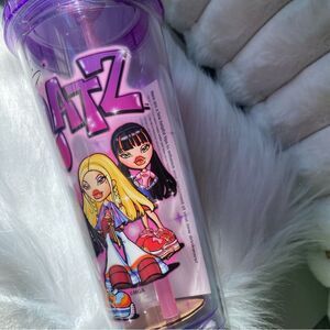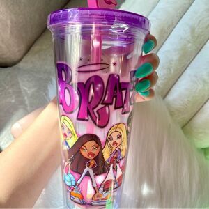 Bratz 24 oz reusable tumbler cup with a purple lid, plastic straw and topper!