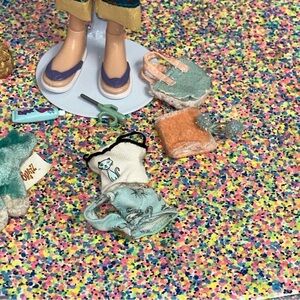 Includes: Doll/Robe (no tie)/Pajama Bottoms/Pajama Short Outfit/Dinosaur/Journal/Curling Iron/Toothpaste/Purse/Sleeping Mask/Slippers/Flip Flops