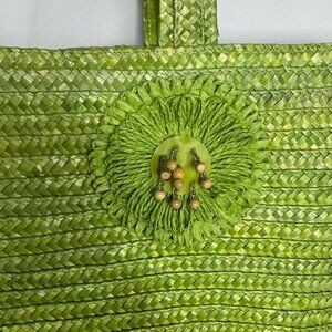 Keywords: green tote bag, woven straw bag, summer handbag, beach tote, straw purse, eco-friendly tote, shoulder bag, decorative bag, handbag with beads, summer accessory, green beach bag, fringed tote, women's tote, lime green purse, lime green summer purse, bratz summer, bratz green, summer vacation, beach vacation, vacationcore