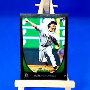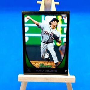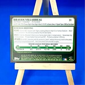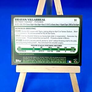 The product is a 2011 Topps baseball trading card featuring pitcher Brayan Villarreal of the Detroit Tigers. This rookie card (#91) is made of card stock and belongs to the Major League (MLB) set. Manufactured by Topps, the card showcases the player in his Detroit Tigers uniform from the 2011 season, making it a sought-after collectible for fans and collectors of baseball trading cards.