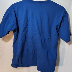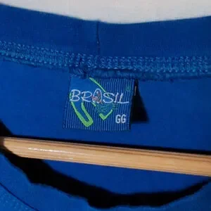 "This men's short-sleeve t-shirt is a solid blue color with a crew neck. The front features \"Brasil\" embroidered in white script, with an embroidered Brazilian flag design directly below it. A small woven tag displaying the Brazilian flag is visible on the right side seam. The neck tag indicates the brand \"BRASIL\" and size \"GG\", which typically corresponds to an XL. The fabric shows some minor creasing but no visible damage."