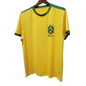 Brazil National Team Home Crewneck Soccer Jersey #7 is a high-quality men's t-shirt in size L. This yellow jersey features a solid pattern with a crew neck and short sleeves, suitable for all seasons. Made from lightweight and breathable fabric, this jersey is designed for comfort and performance. Machine washable and with a collarless design, it is perfect for representing the Brazilian national team in style. Ideal for sports enthusiasts and fans of the Brazilian home team.