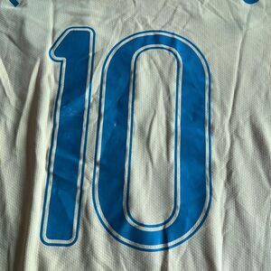 Light wear with minor peeling on the back RONALDINHO lettering and the back 10; light wear to the front 10 print. Fabric shows normal wrinkles from storage. No holes or stains observed. Stitching, crest, and Nike Swoosh appear intact.