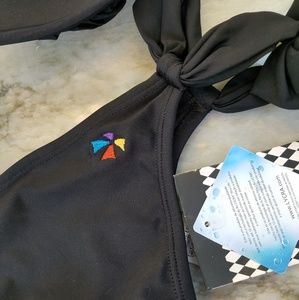 Teca- BLACK ONLY: 2pc Bikini, Brazilian Cut (runs small). Cute Black suit with large adjustable bead on either strap. Top has full lightly padded cups, non-movabale, halter style tie at neck & back. Botton has looped side tie. Emblem on back side of bottom. Made of Xtra Life Lycra. (Color: Black). Always kept in a smoke, pet & child free environment.