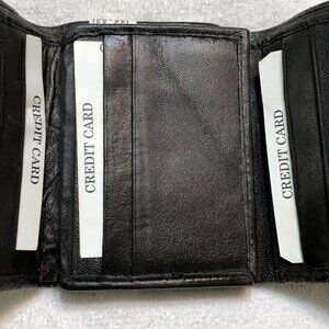 This leather tri-fold wallet features a thoughtfully designed layout. 12 Card Slots, including 1 ID card slot and 2 cash slots