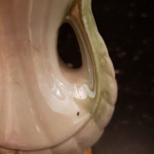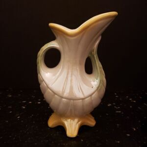 Beautiful small handled vase with wide open fish mouth top and a lusterware pearlized iridescent glaze. Abstract design. Decorated in soft beautiful colors. Yellow trims the top and foot. Green on the handles and foliage and pink flowers. Stamped number 430 and Made in Brazil on bottom.