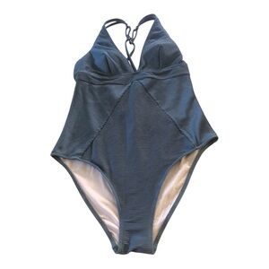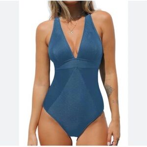 Stylish teal one-piece swimsuit with a deep V-neck design.