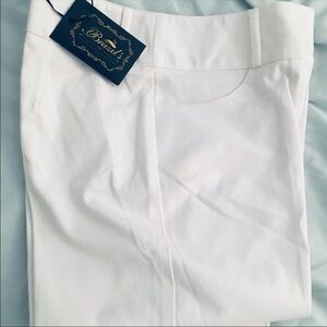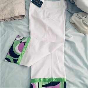 Adorable white stretch capris from Brazil with beautiful detailing on bottoms of him missing one button on green bow two pocket wide belt loops clasp and zip closure back darts 22” inseam New with tags