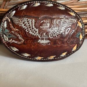 Leather western Brazos Joe Belts Vintage eagle belt buckle. Vintage leather belt buckle crafted by Brazos Joe Belts. Buckle has eagle on the front with silver lacing around edging. There is some wear on the paint that adds to the vintage charm of this piece. **See pictures for measurements and condition**