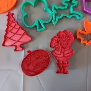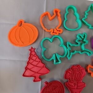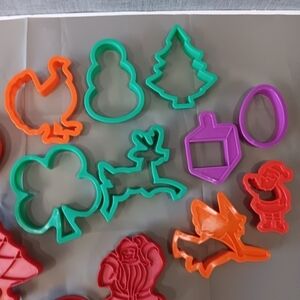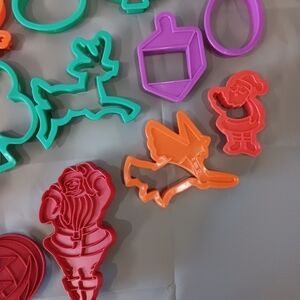 Up for sale is a lot/set of 13 holiday themed/shaped cookie cutters. They can also be used to cut a mold/shape out of a piece of bread/sandwich. I want to say they are standard size. The green Christmas tree measures about 4 inches tall by 3.25 inches wide. They are made of plastic so they are easy clean and reusable. I'll be putting up several lots of different shaped/themed cookie cutters soon if you'd like to take a look. Thanks for looking!