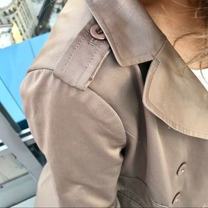 Champagne trench coat with pleated detail and removal collar fur lining.