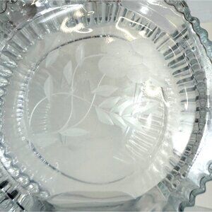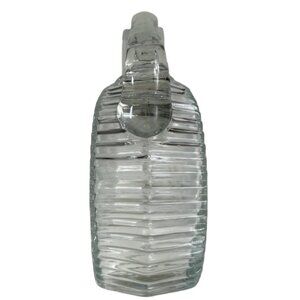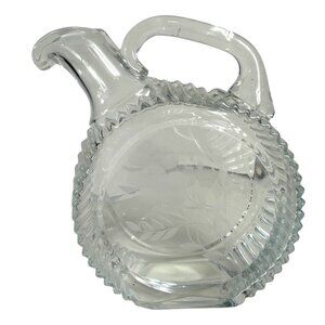 This vintage clear glass pitcher features an elegant etched floral design and ribbed sides, offering both aesthetic appeal and functionality for serving. Its sturdy handle and spout ensure ease of pouring. The classic design enhances any kitchen or dining setting, while the intricate details reflect skilled craftsmanship.